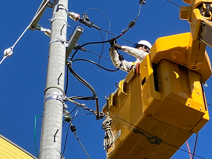 内線工事は、一般住宅の配線工事や公共施設のLED工事、ケーブルの更新工事、キュービクルやトランスの更新工事、太陽光発電などの仕事です。